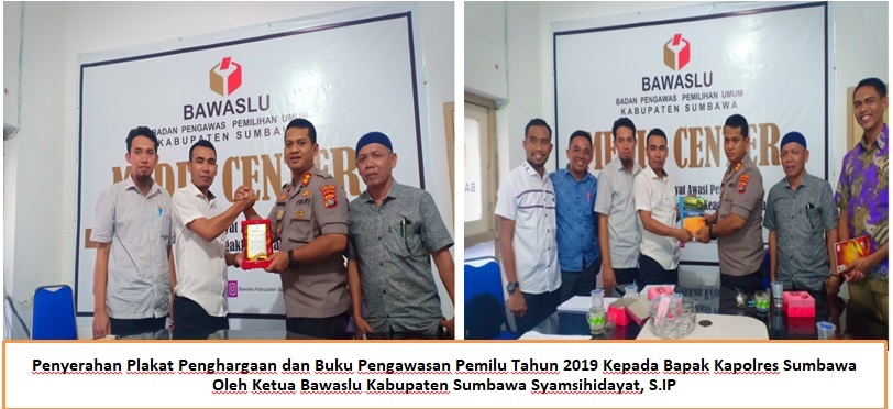 \n\n\n\nDiakhir Rakor ini, dilakukan penyerahan buku IKP Pemilu 2019 dan Buku Catatan Hasil Pengawasan DPR, DPD, DPRD dan Pilpres Tahun 2019, serta diserahkan juga plakat penghargaan kepada Kapolres Sumbawa oleh Ketua Bawaslu Kabupaten Sumbawa yang didampingi oleh Ketua KPU, Pimpinan Bawaslu dan Ketua PWI. By.Humas