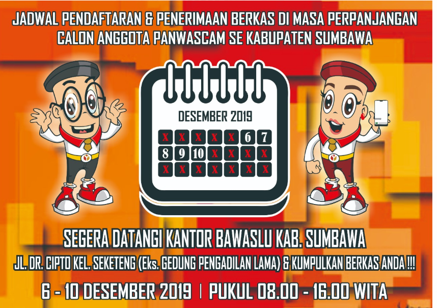 \n\n\n\nBawaslu Kabupaten Sumbawa kembali membuka perpanjangan masa Pendafataran Recruitment Pengawas Kecamatan .... Khususnya di 5 Kecamatan, yaitu : Kecamatan Alas Barat, Kecamatan Lantung, Kecamatan Orong Telu, Kecamatan Lunyuk dan Kecamatan Lenangguar....