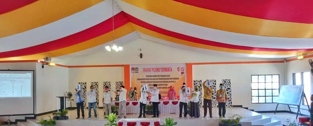 \n\n\n\nDari hasil penarikan yang dilakukan, inilah nomor urut 5 pasangan calon dalam Pilkada Sumbawa 9 Desember 2020, Dalam pengundian itu nomor urut 1. H.M. Husni Djibril B.Sc - Dr. H. Ikhsan M.Pd, nomor urut 2. Nurdin Ranggabarani SH., MH - H. Burhanuddin Ja’far Salam SH., MH, diikuti nomor urut 3. Ir. Talifuddin M.Si - Sudirman S.IP, Selanjutnya nomor urut 4. pasangan Drs. H. Mahmud Abdullah - Dewi Noviany M.Pd. Terakhir nomor urut 5. pasangan Ir. H. Syarifuddin Jarot M.P - Ir. H. Mokhlis M.Si.