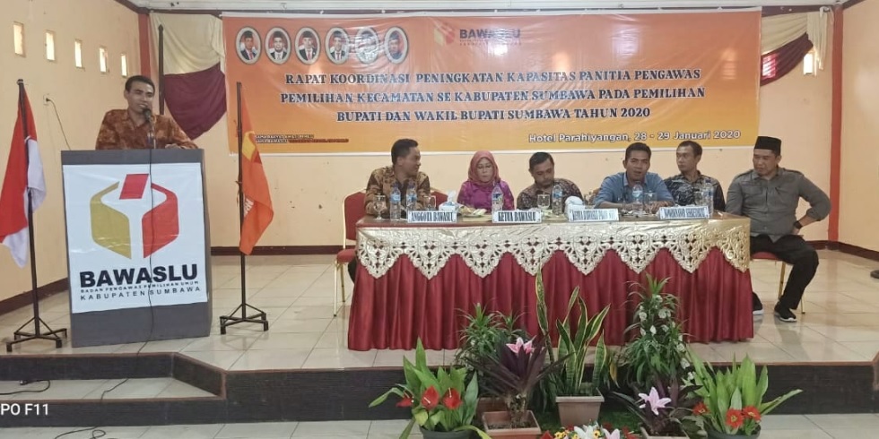 \n\n\n\nKapasitas Pengawas Pemilihan di tingkat Kecamatan (Panwascam) harus terus ditingkatkan, sehingga dalam pelaksanaan tugasnya dapat optimal dan mampu mengambil tindakan sesuai aturan perundang-undangan yang berlaku. Karenanya Bawaslu Kabupaten Sumbawa melaksanakan kegiatan Rapat Koordinasi (Rakor) Peningkatan Kapasitas Jajaran Pengawas Pemilihan Tingkat Kecamatan, di Hotel Parahiyangan, 28—29 Januari 2020. Hadir dalam Rakor tersebut Pimpinan Bawaslu Provinsi NTB, Dr. Hj. Yuyun Nurul Azmi, SPt., M, yang didampingi oleh seluruh Pimpinan Bawaslu Kabupaten Sumbawa dan Koordinator Sekretariat.