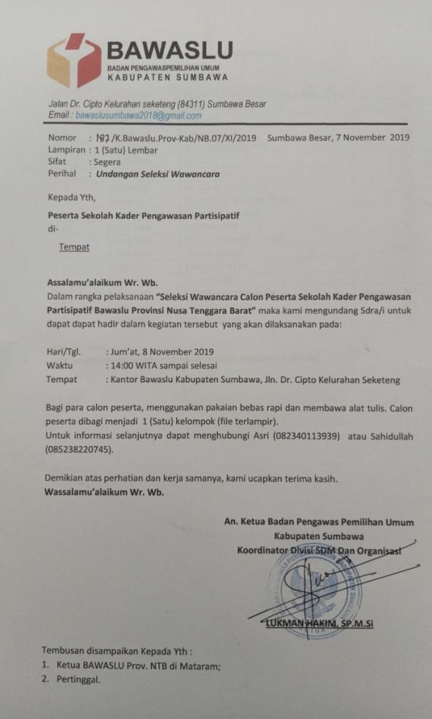 Undangan Seleksi Wawancara Sekolah Kader Pengawas Partisipatif